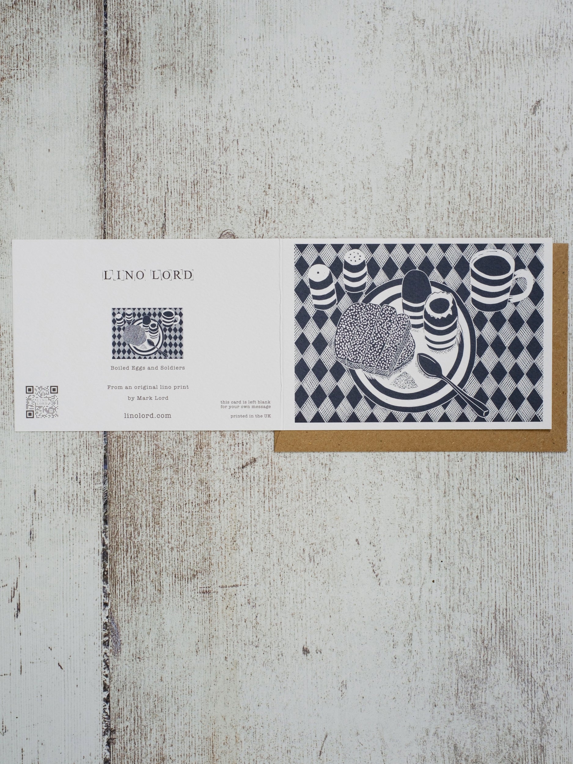 From an original Lino Lord design printed on sustainable Tintoretto Gesso 350gsm card in the UK. The card is left blank inside for your own message and comes with a brown Kraft envelope.