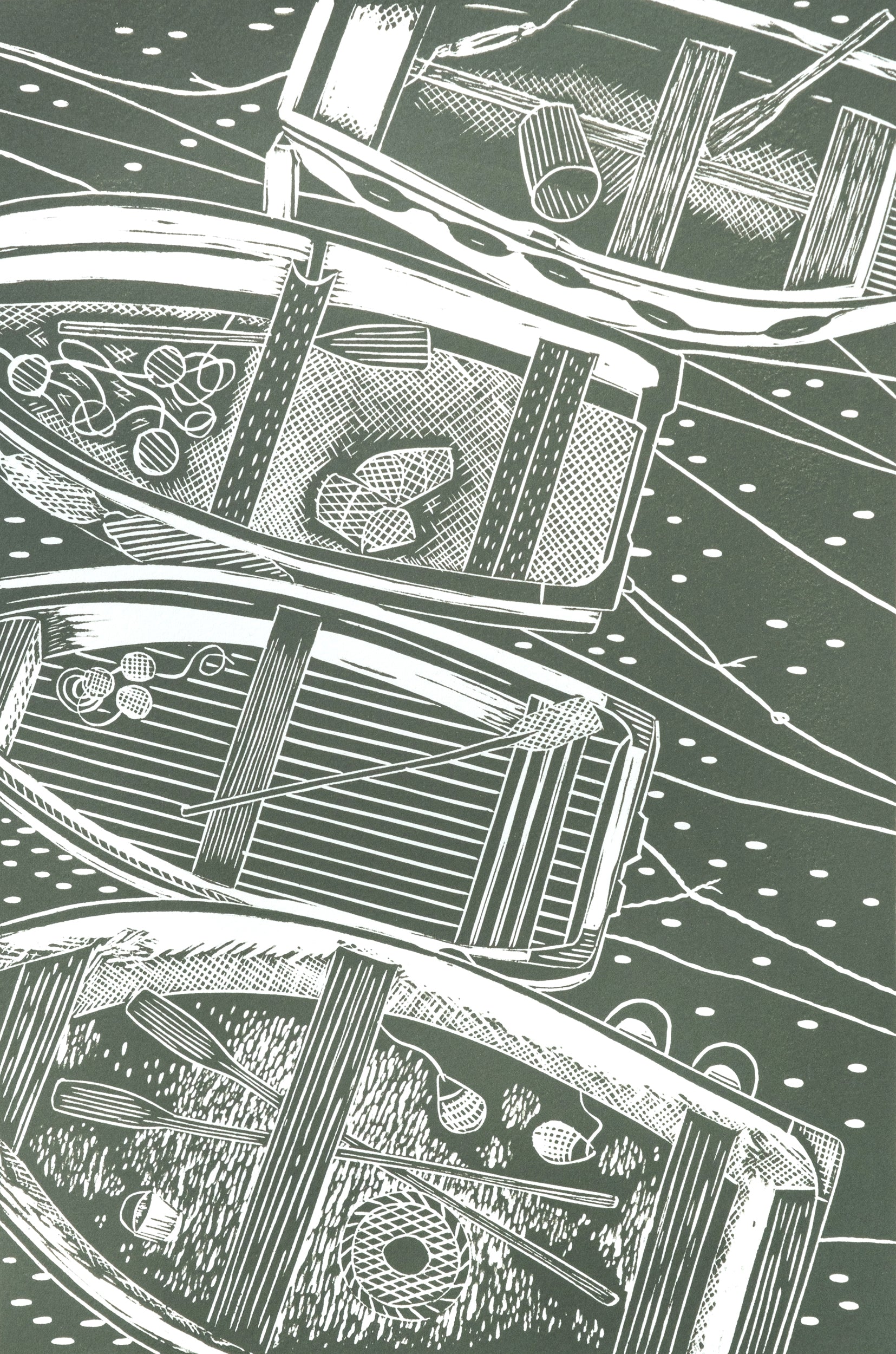 Limited edition lino print of four rowing boats or Fisherman's tenders off the quay in St Ives, Cornwall printed in a beautiful wild green colour.