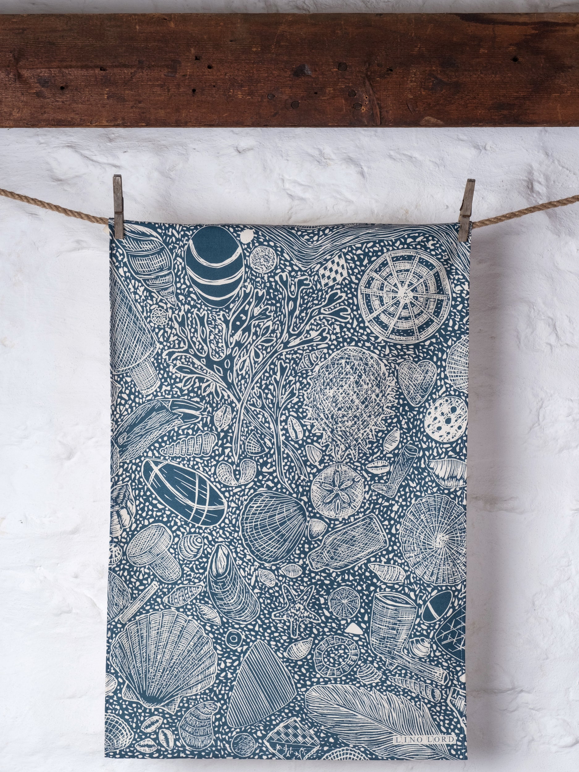 Organic Cotton Tea Towel with Hidden Beach Finds Lino Print