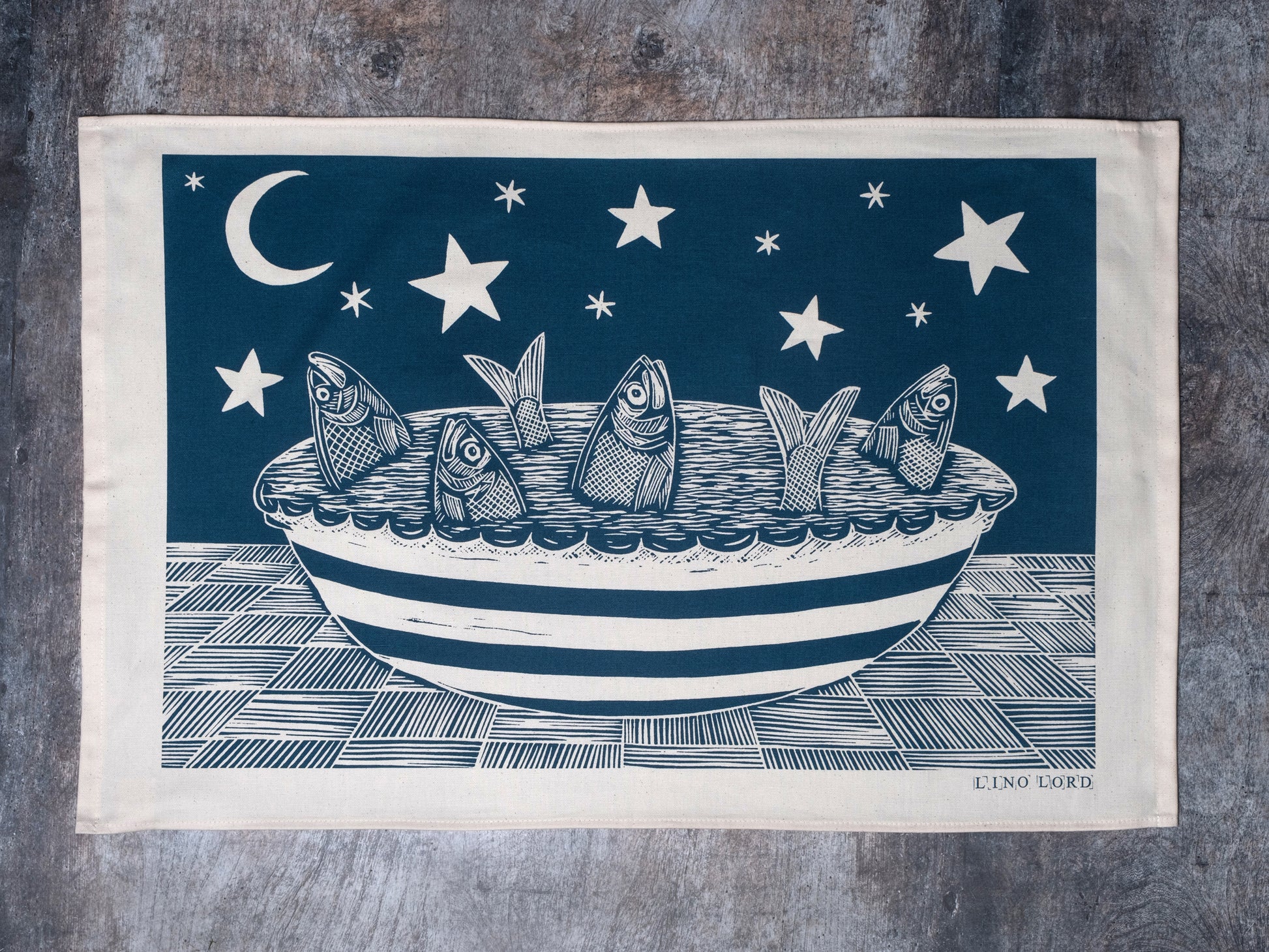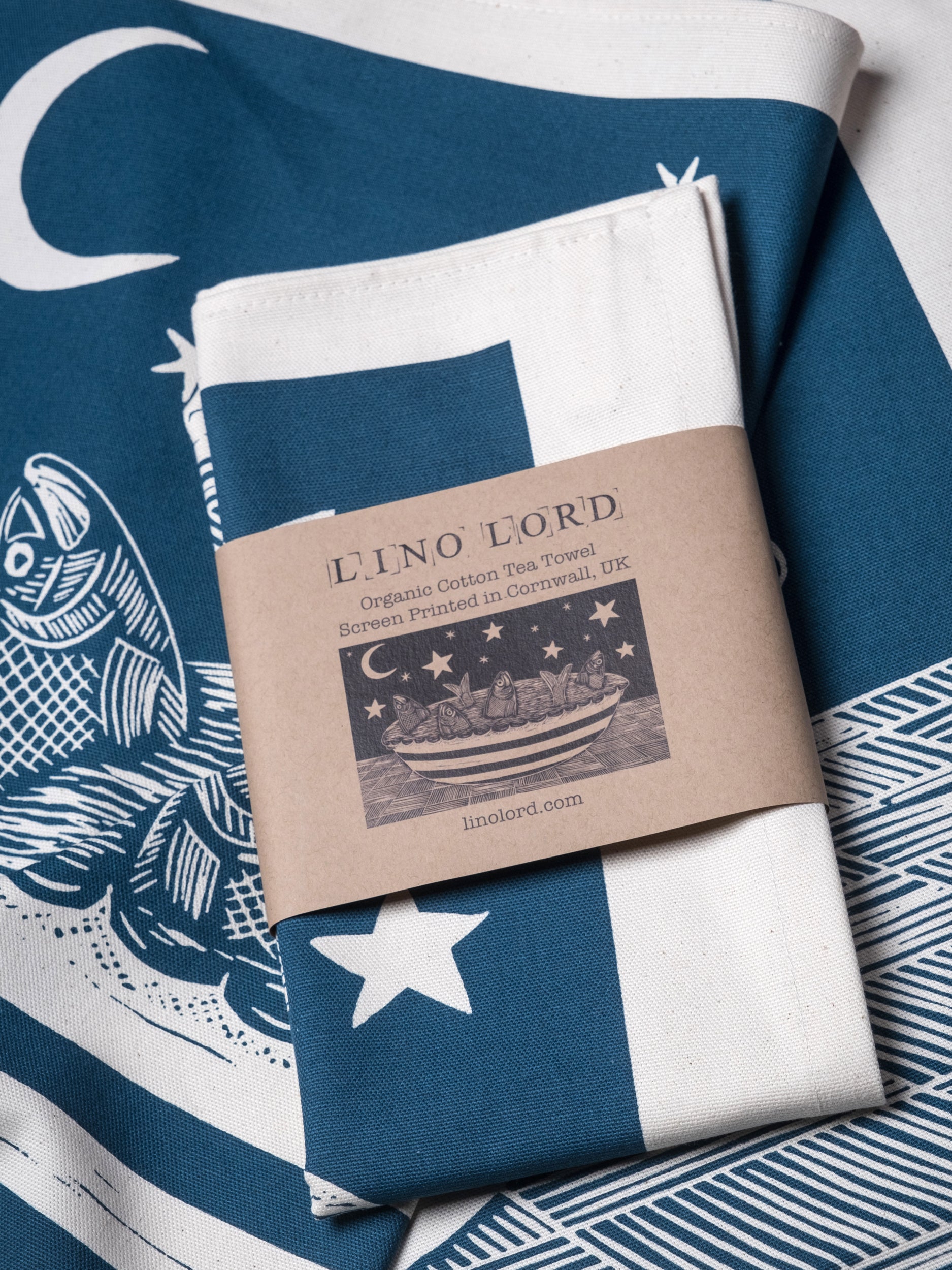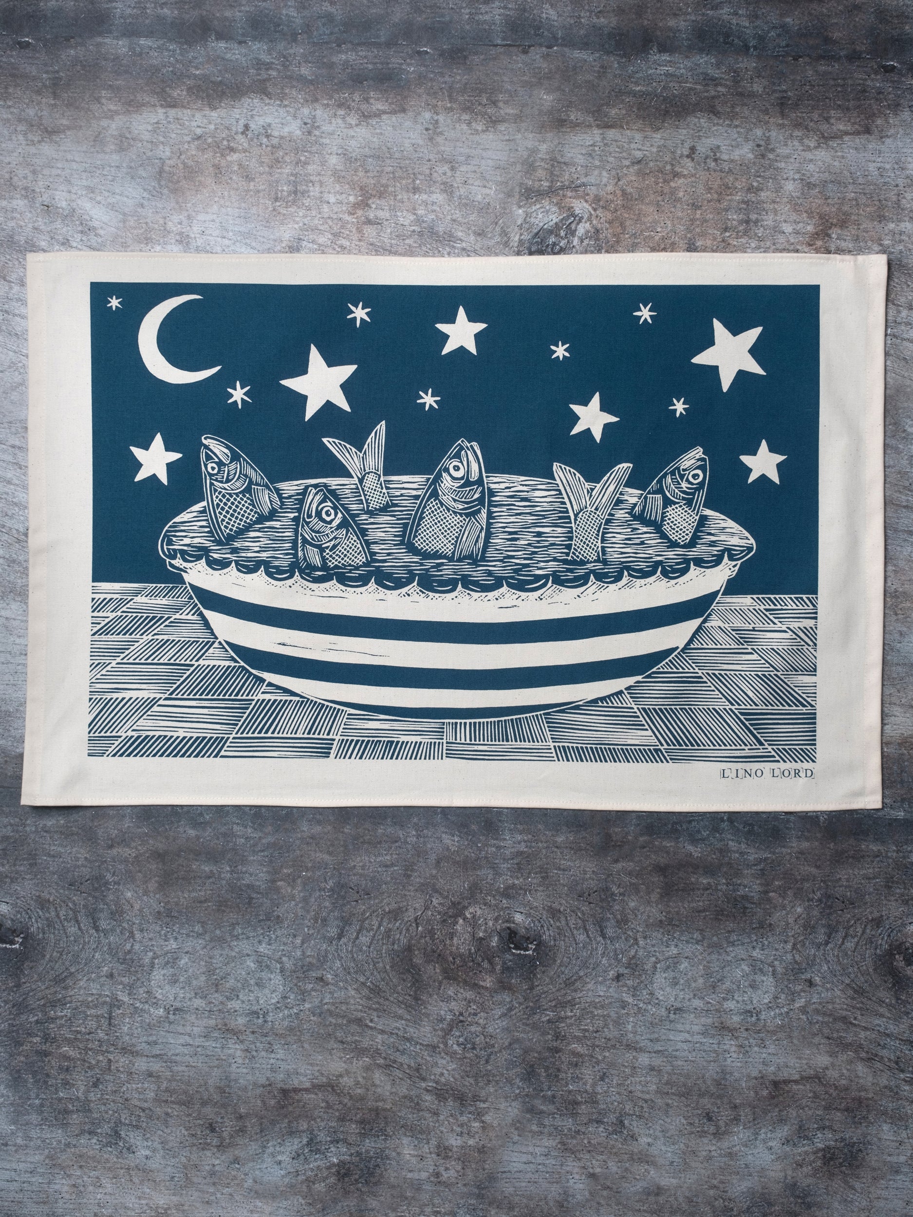 Organic Cotton Tea Towel with my original Stargazy Pie Lino print.