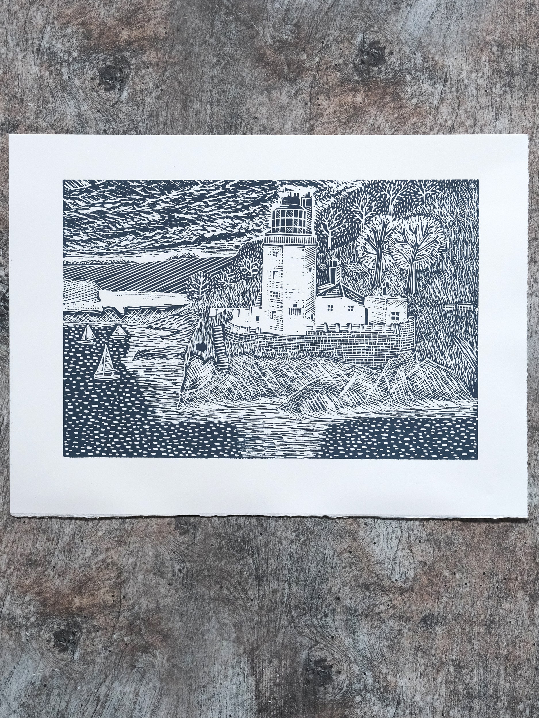 Limited edition lino print, inspired by the beautiful St Anthony's Lighthouse in Roseland, Cornwall.